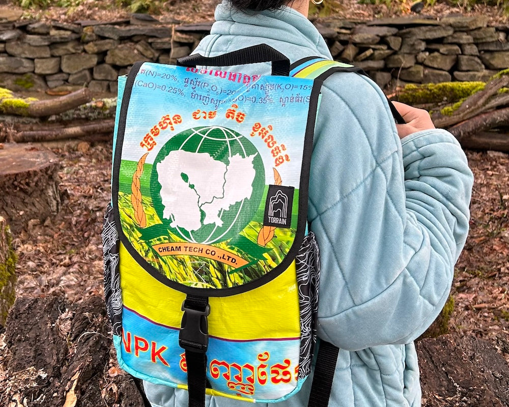 - Exterior material is upcycled from feed and cement bags, Interior material is recycled from plastic bottles